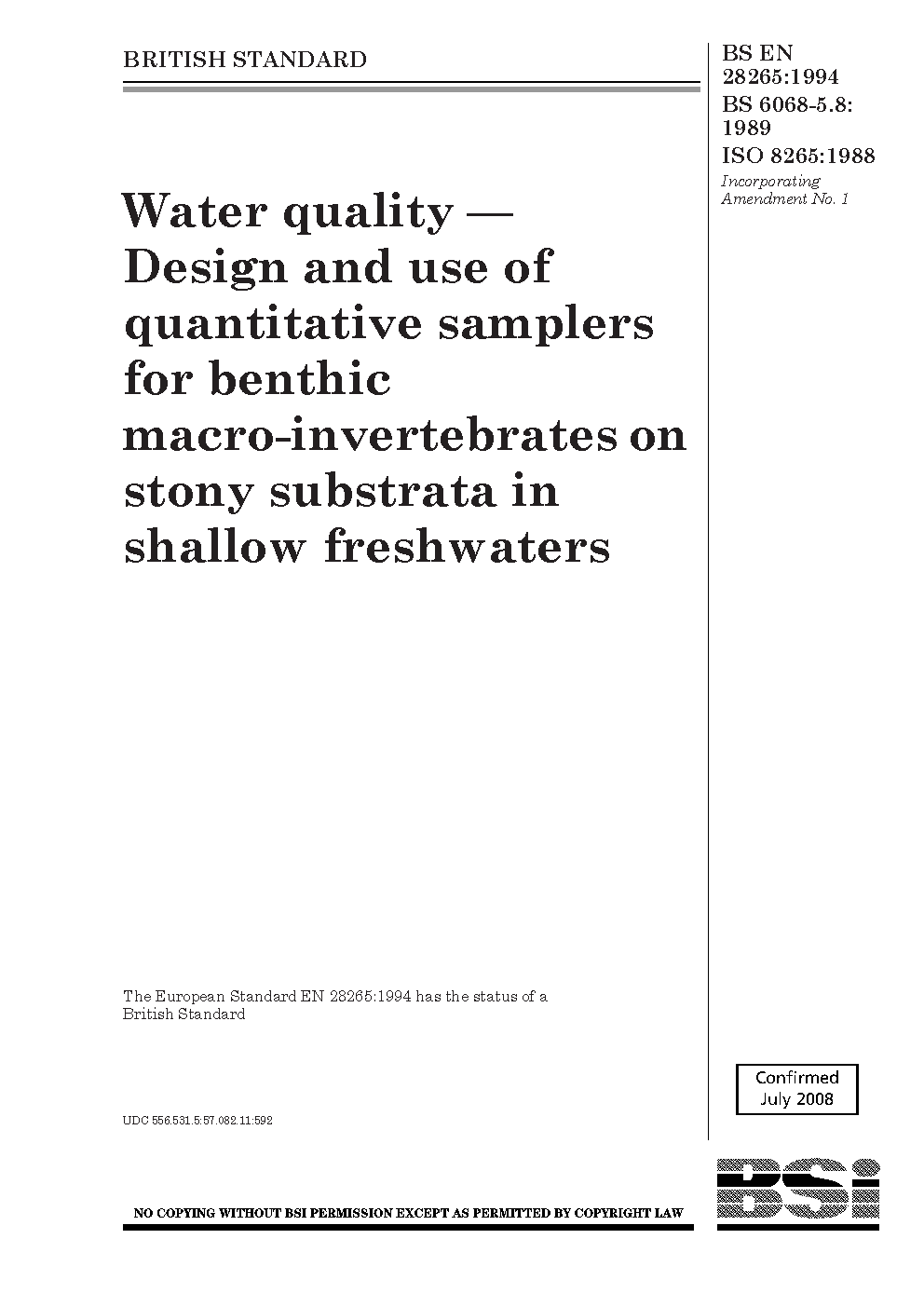 Water quality. Biological methods. Methods of biological sampling: guidance on the design and use of quantitative samplers for benthic macro-invertebrates on stony substrata in shallow freshwater
