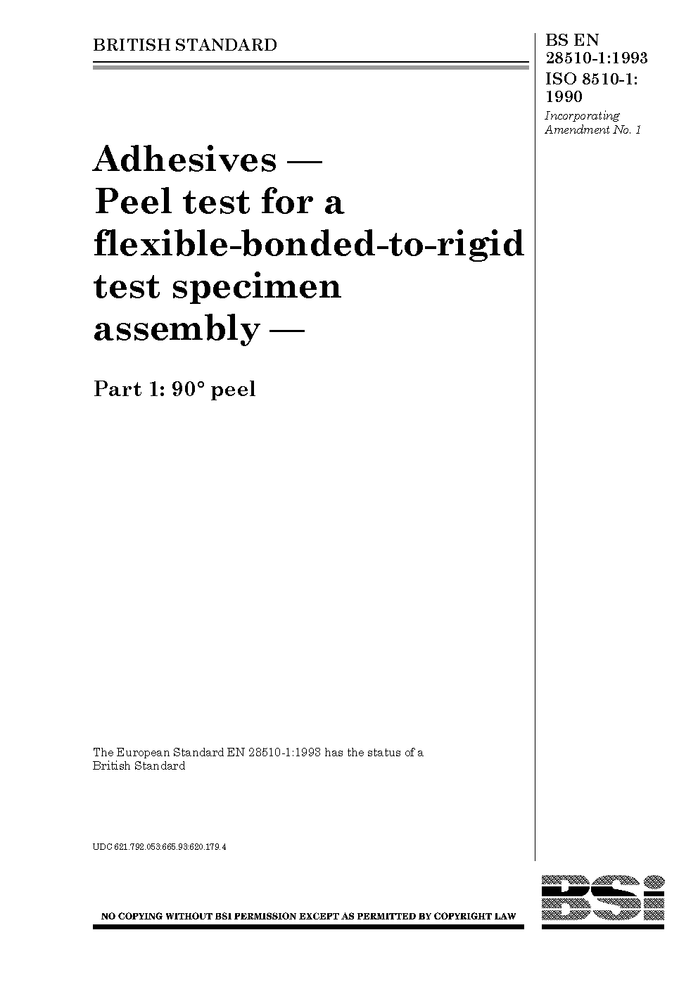 Adhesives. Peel test for a flexible-bonded-to-rigid specimen assembly 90° peel
