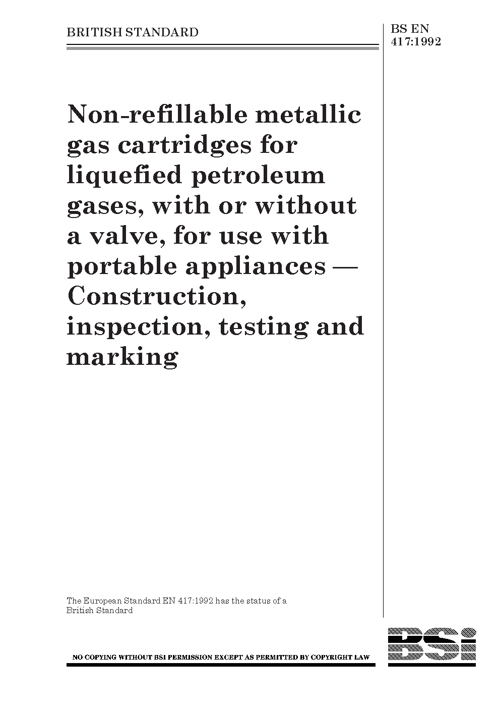 Non-refillable metallic gas cartridges for liquefied petroleum gases, with or without a valve, for use with portable appliances. Construction, inspection, testing and marking