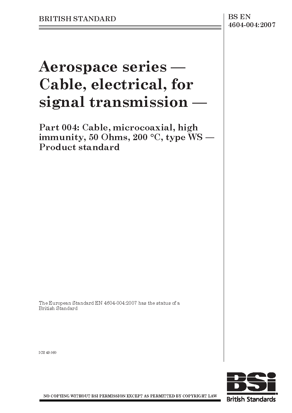 Aerospace series. Cable, electrical, for signal transmission microcoaxial, high immunity, 50 Ohms, 200°C, type WS. Product standard