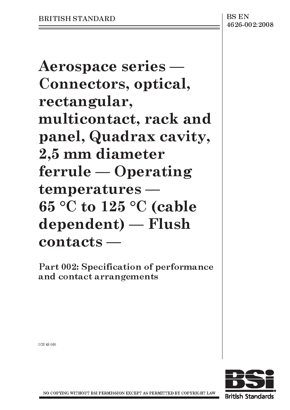 Aerospace series. Connectors, optical, rectangular, multicontact, rack and panel, Quadrax cavity, 2,5 mm diameter ferrule. Operating temperatures -65°C to 125°C (cable dependent). Flush contacts Specification of performance contact arrangements