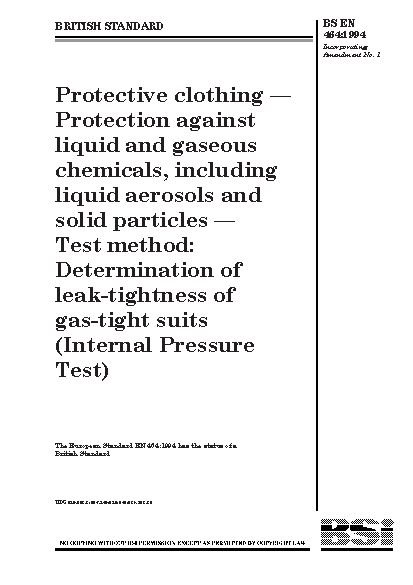 Protective clothing. Protection against liquid and gaseous chemicals, including liquid aerosols and solid particles. Test method. Determination of leak-tightness of gas-tight suits (Internal Pressure Test)