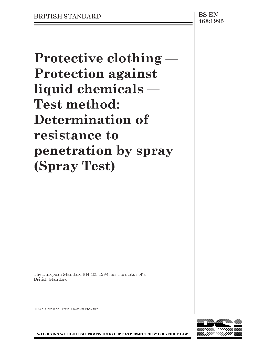 Protective clothing for use against liquid chemicals. Test method. Determination of resistance to penetration by spray (Spray Test)