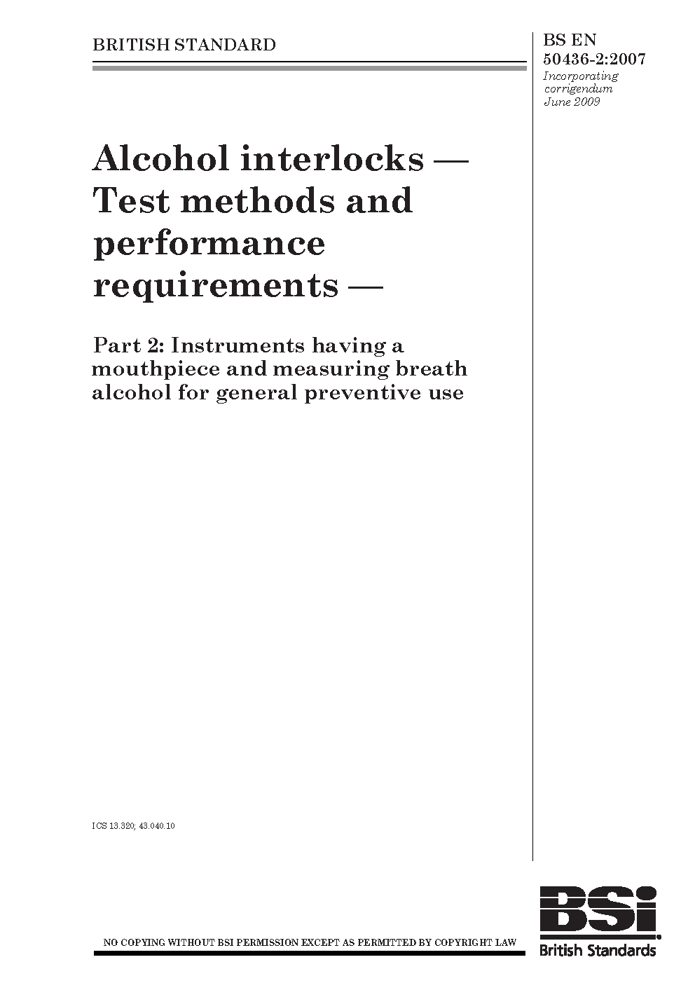 Alcohol interlocks. Test methods and performance requirements Instruments having a mouthpiece measuring breath alcohol for general preventive use