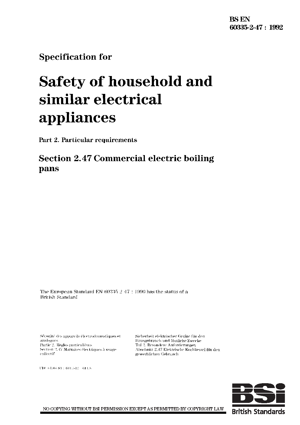 Specification for safety of household and similar electrical appliances. Particular requirements Commercial electric boiling pans