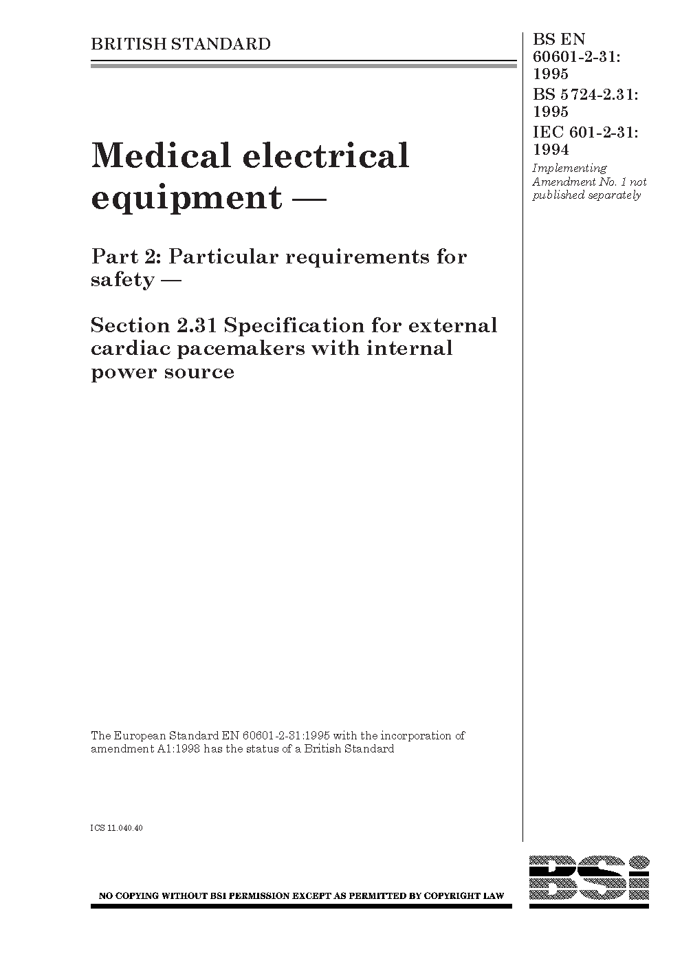 Electrical medical equipment;Electrical safety;Watertightness tests;Electronic equipment and components;Electrical insulation;Leakage currents;Hazards;Medical equipment;Environmental testing;Artificial organs;External;Cardiology;Electrical equipment;Equipment safety;Pacemakers;Marking;Safety measures