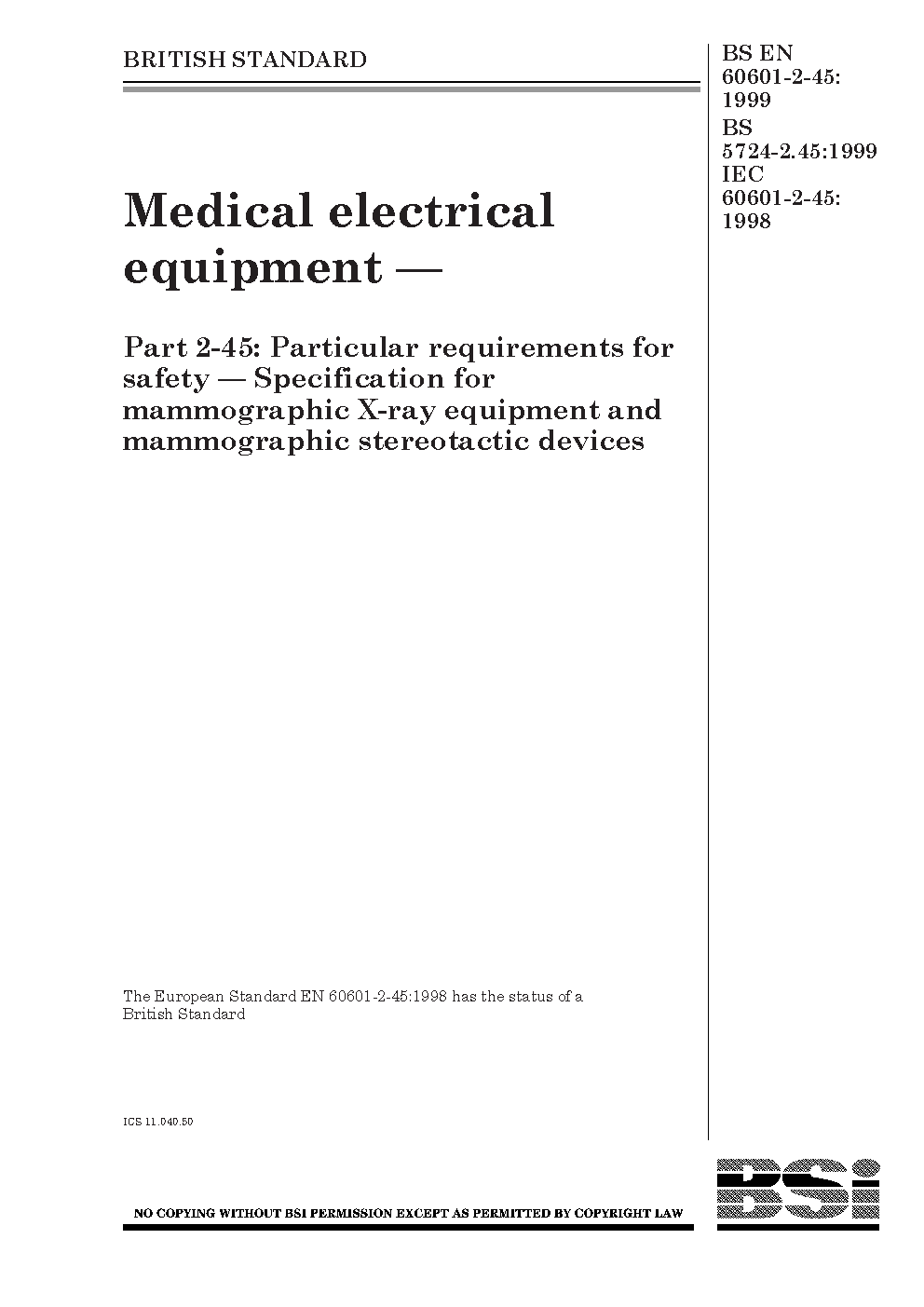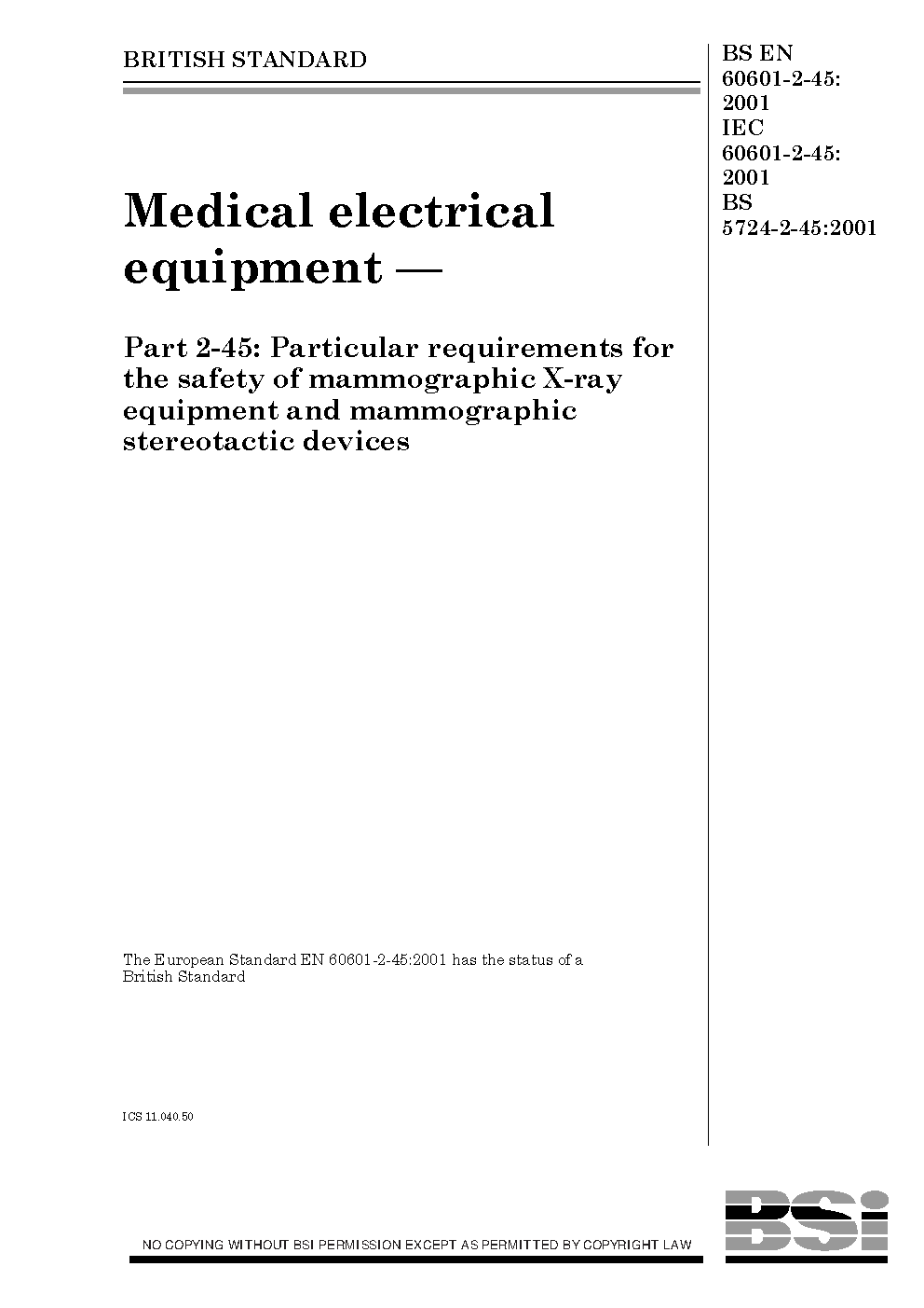 Medical electrical equipment Particular requirements for safety. Specification mammographic X-ray and stereotactic devices