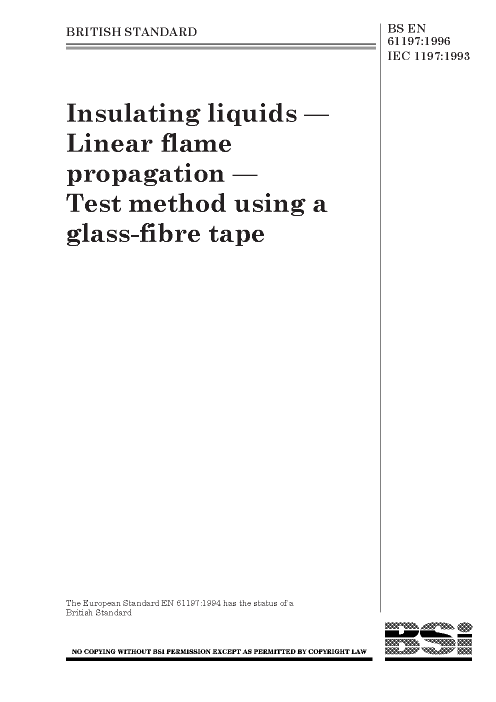 Insulating liquids. Linear flame propagation. Test method using a glass-fibre tape