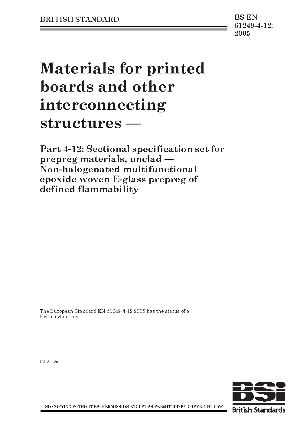 Materials for printed boards and other interconnecting structures Sectional specification set prepreg materials, unclad. Non-halogenated multifuctional epoxide woven E-glass prepeg of defined flammability