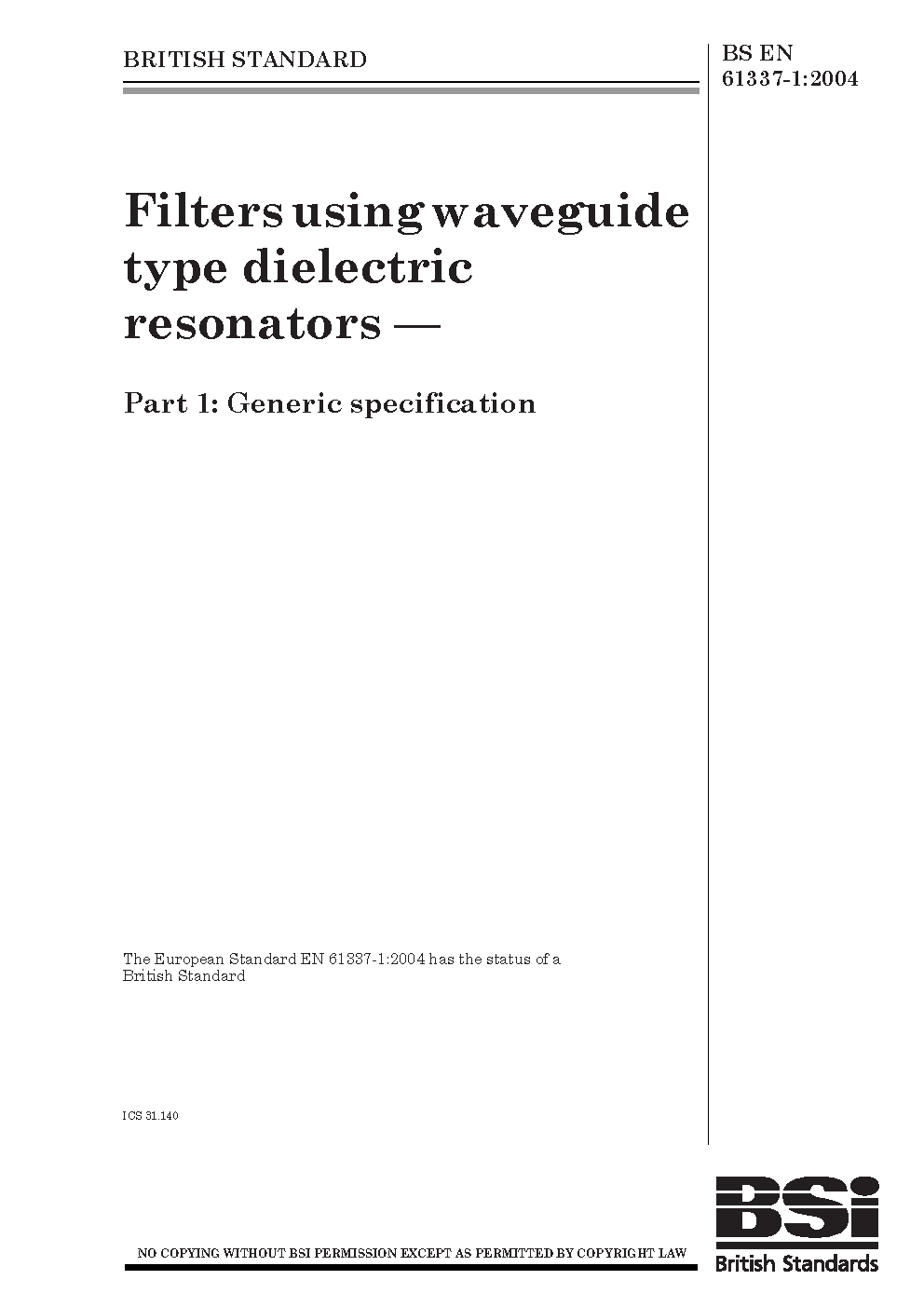 Filters using waveguide type dielectric resonators Generic specification