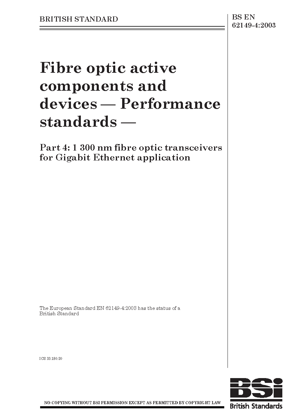 Fibre optic active components and devices. Performance standards 1300 nm fibre transceivers for Gigabit Ethernet application