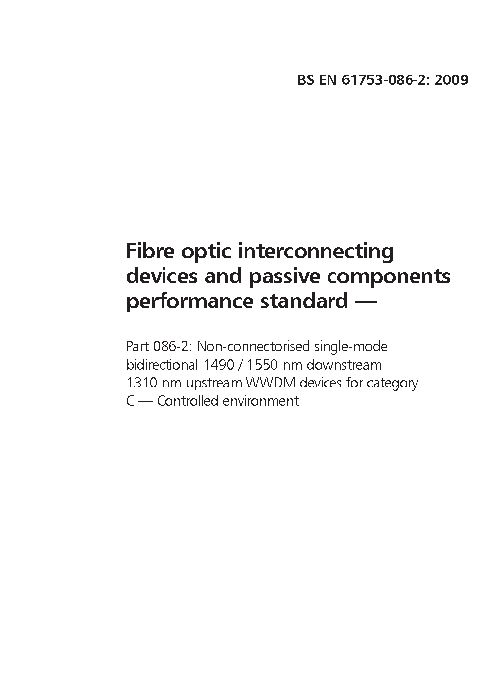 Fibre optic interconnecting devices and passive components. Performance standard Non-connectorized single-mode bidirectional 1490 / 1550 nm downstream 1 310 upstream WWDM for category C. Indoor controlled environment