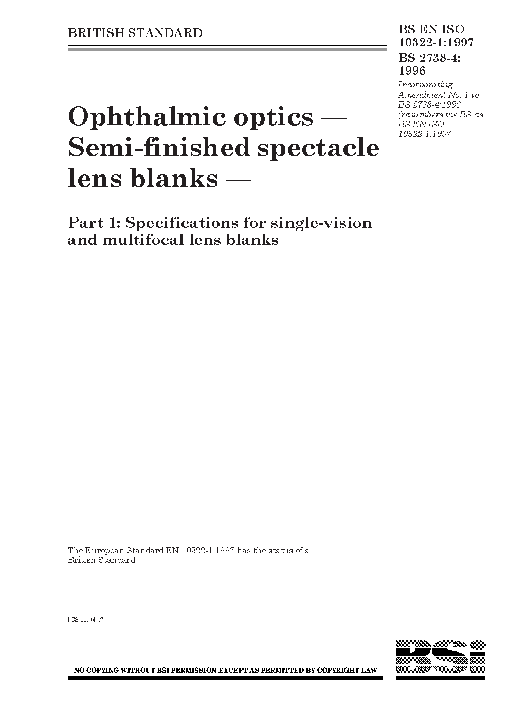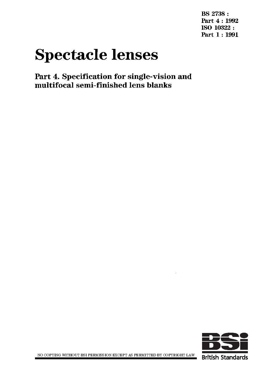 Ophthalmic optics. Semi-finished spectacle lens blanks Specifications for single-vision and multifocal