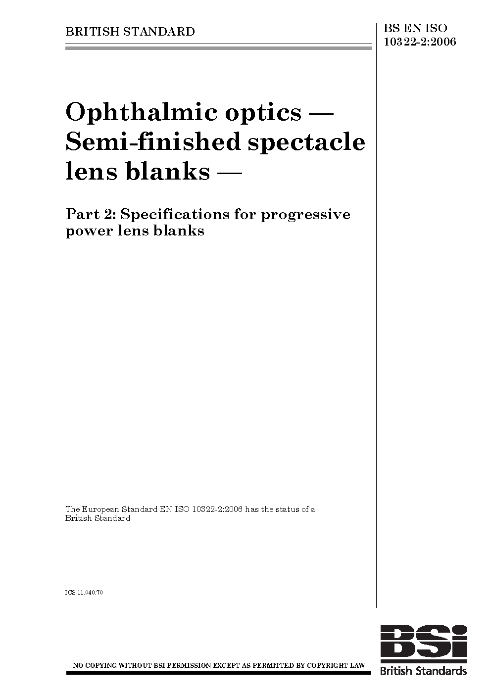 Ophthalmic optics. Semi-finished spectacle lens blanks Specifications for progressive power