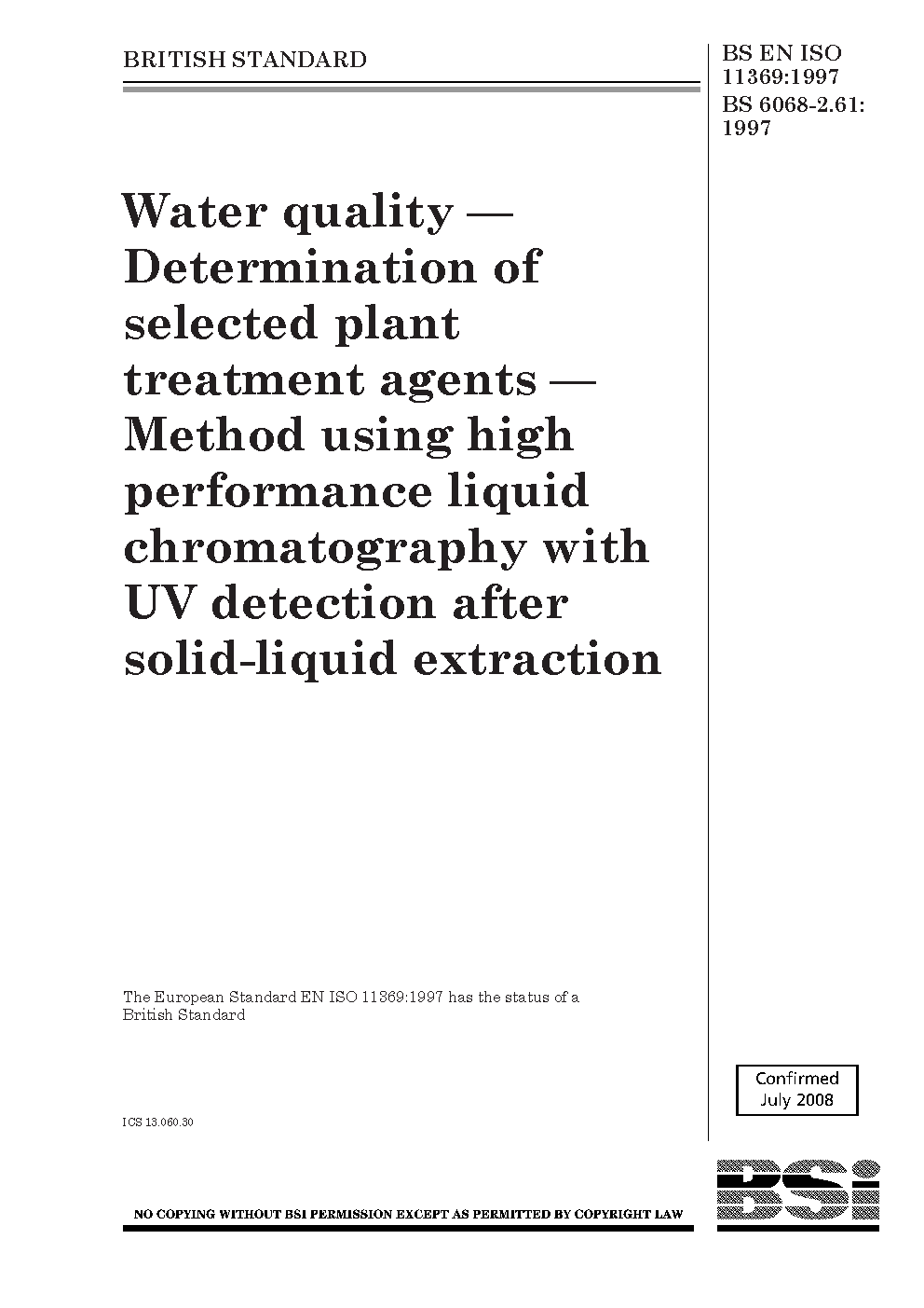 Water quality. Determination of selected plant treatment agents. Method using high performance liquid chromatography with UV detection after solid-liquid extraction