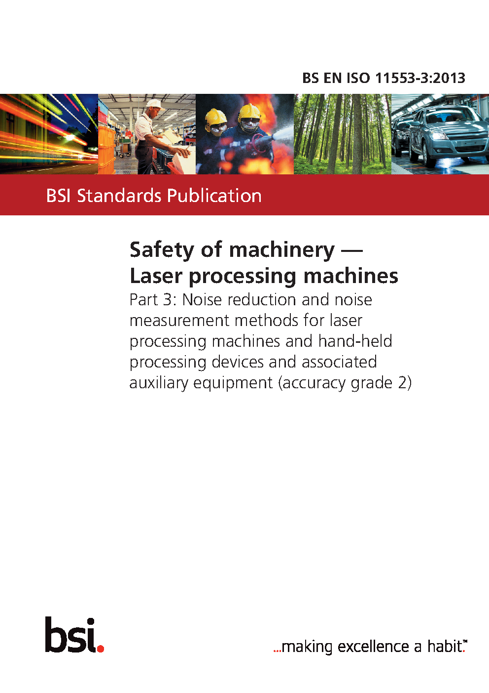 Safety of machinery. Laser processing machines Noise reduction and noise measurement methods for laser hand-held devices associated auxiliary equipment (accuracy grade 2)