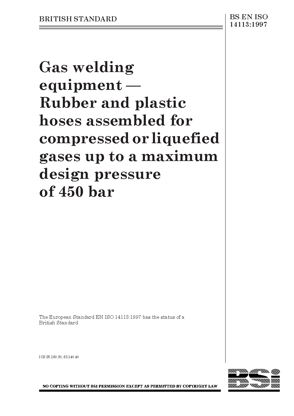 Marking;Rubber;Pressure pipes;Liquefied gases;Approval testing;Welding equipment;Temperature;Electrical conductivity;Permeability;Compressed gases;Gas-welding equipment;Pressure testing;Oxygen cutting;Acetylene;Ignitability;Flexible pipes;Type testing;Dimensions;Pressure;Chemical-resistance tests;Dimensional tolerances;Leak tests;Flexibility;Plastics;Instructions for use