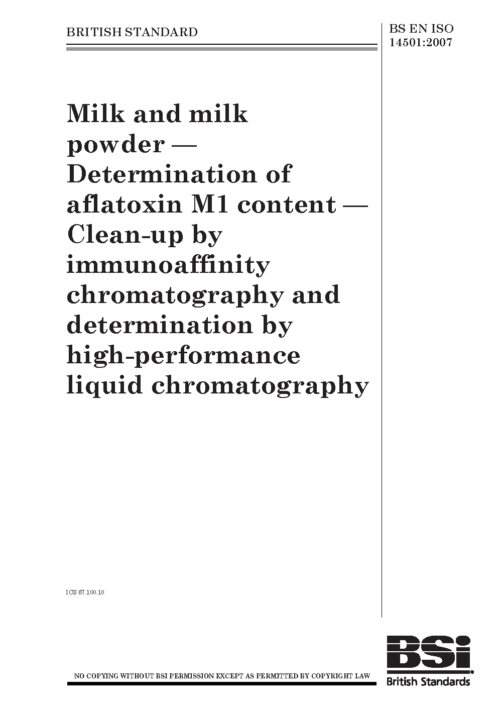 Milk and milk powder. Determination of aflatoxin M1 content. Clean-up by immunoaffinity chromatography and determination by high-performance liquid chromatography