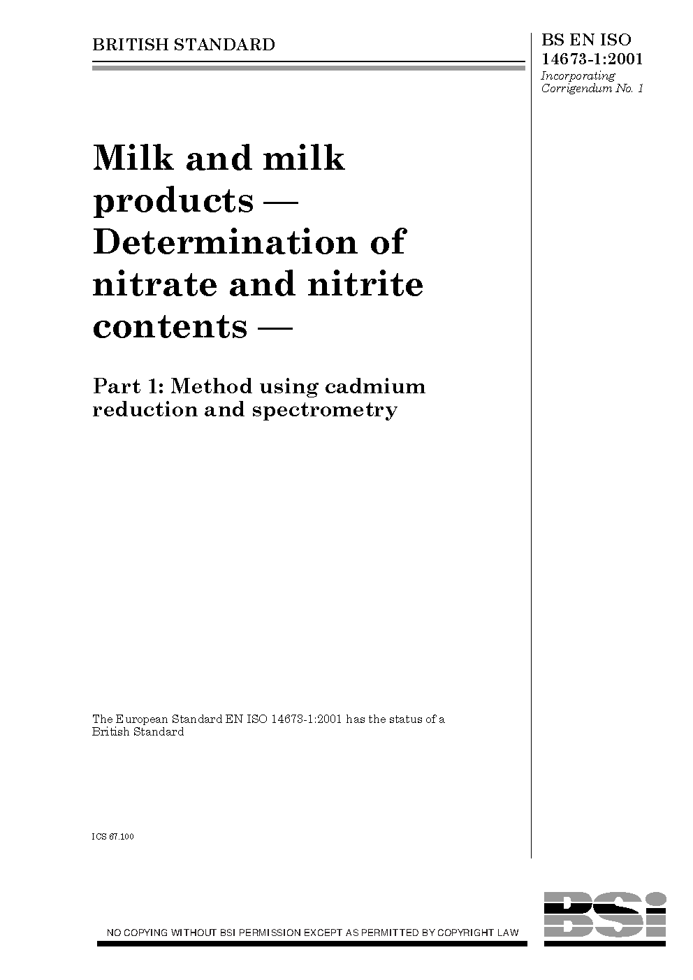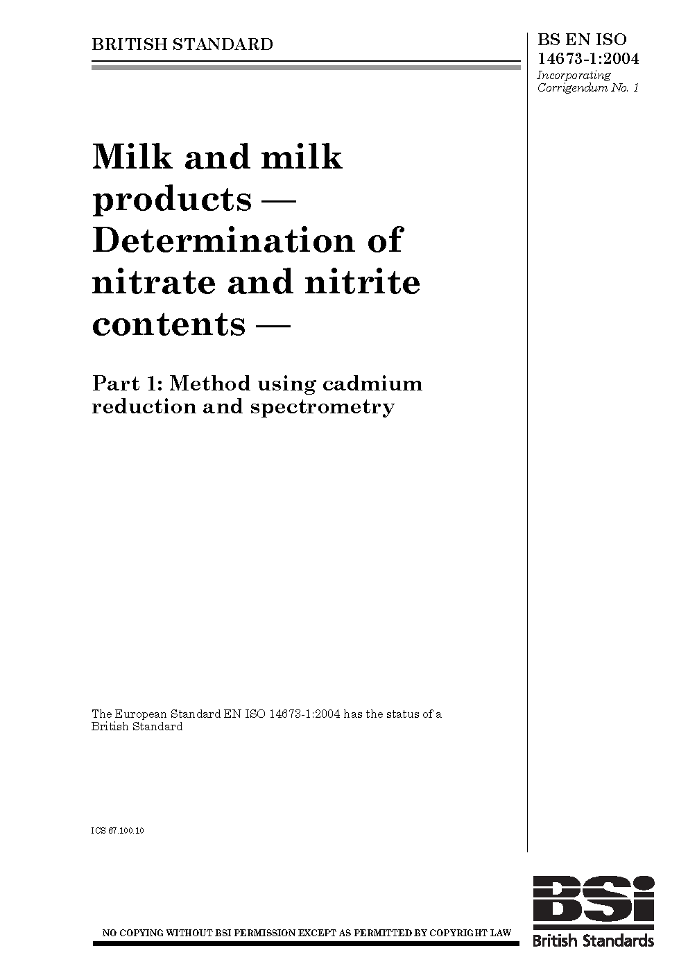 Milk and milk products. Determination of nitrate nitrite contents Method using cadmium reduction spectrometry