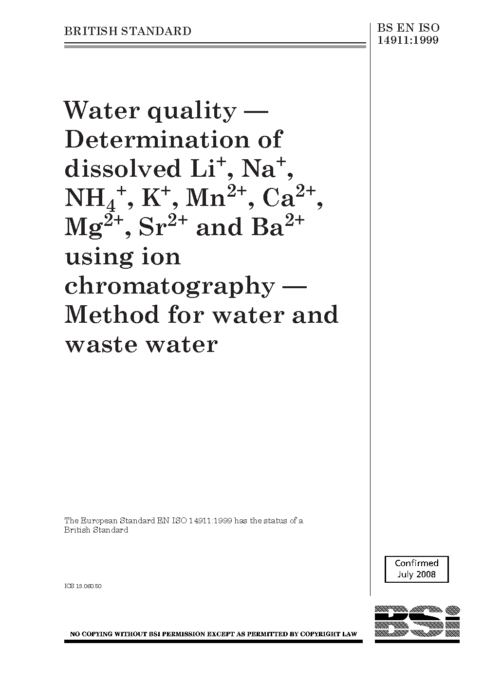 Water quality. Determination of dissolved Li+, Na4+, NH4+, K+, Mn2+, Ca2+, Mg2+, Sr2+ and Ba2+ using ion chromatography. Method for water and waste water