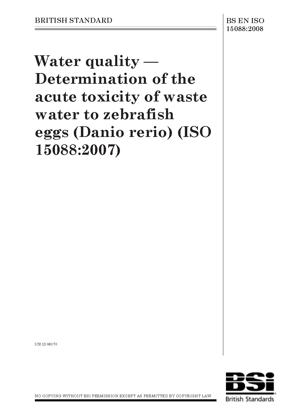 Water quality. Determination of the acute toxicity of waste water to zebrafish eggs (Danio rerio)