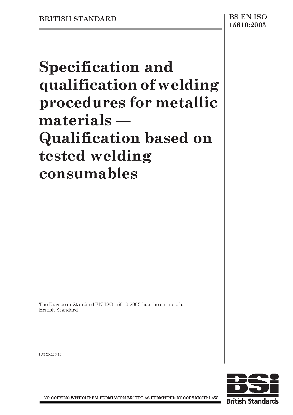 Specification and qualification of welding procedures for metallic materials. Qualification based on tested welding consumables