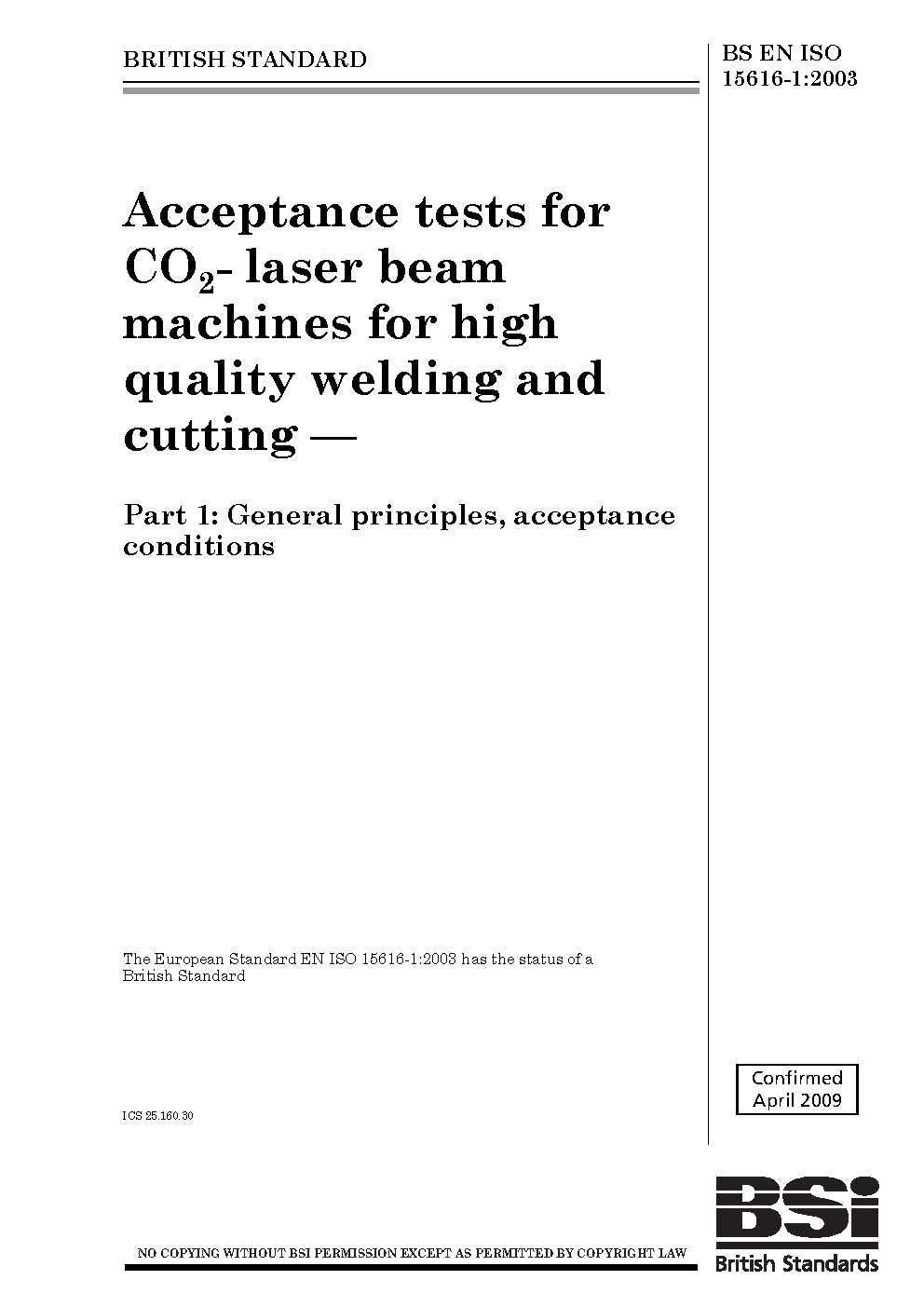 Acceptance tests for CO2- laser beam machines high quality welding and cutting General principles, acceptance conditions