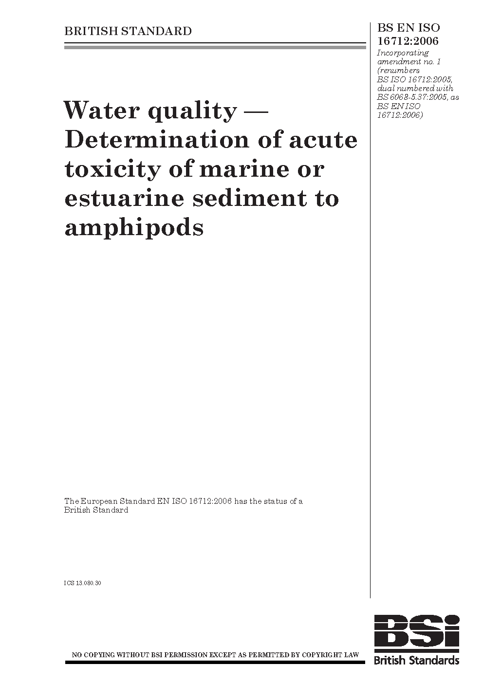 Water quality. Determination of acute toxicity of marine or estuarine sediment to amphipods