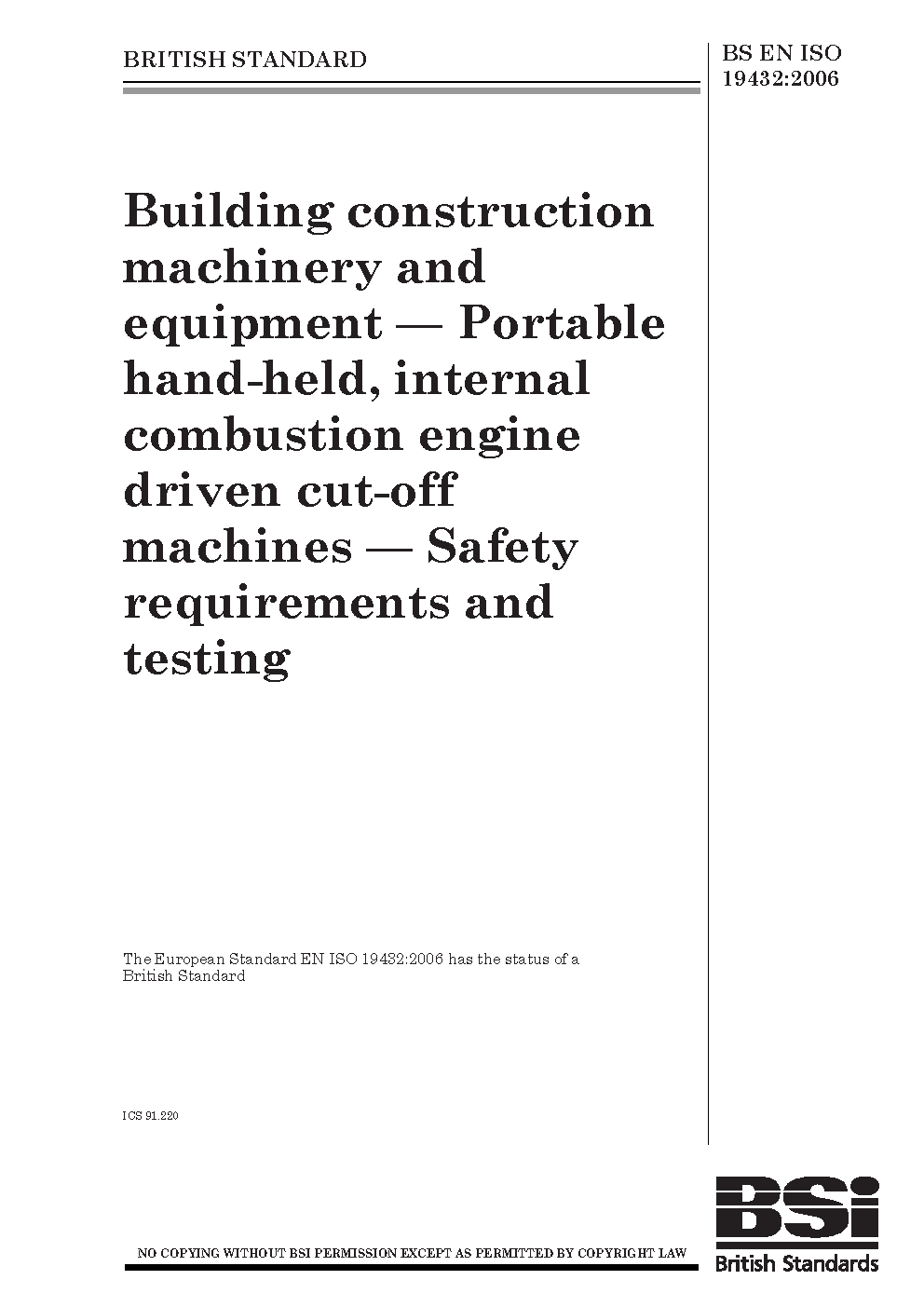 Building construction machinery and equipment. Portable, hand-held, internal combustion engine driven cut-off machines. Safety requirements and testing