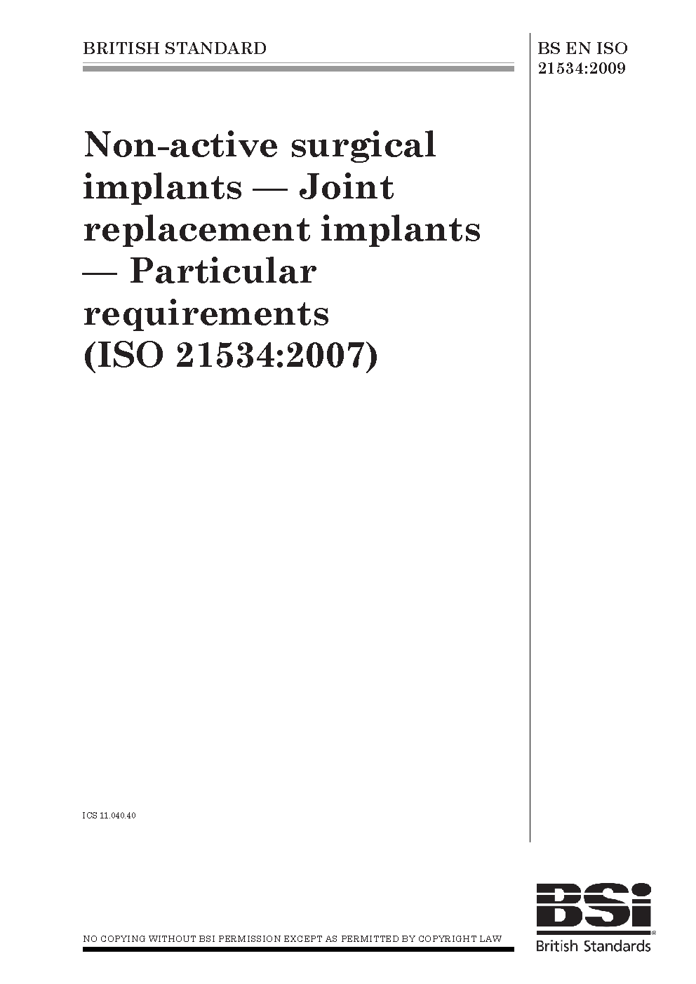Non-active surgical implants. Joint replacement implants. Particular requirements