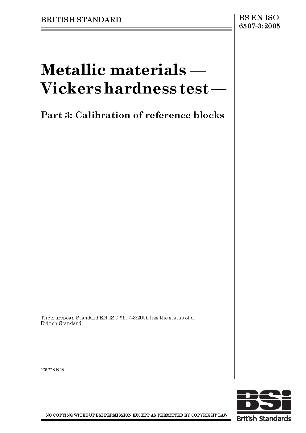 Metallic materials. Vickers hardness test Calibration of reference blocks