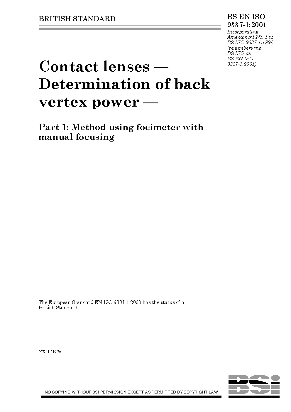 Contact lenses. Determination of back vertex power Method using focimeter with manual focusing