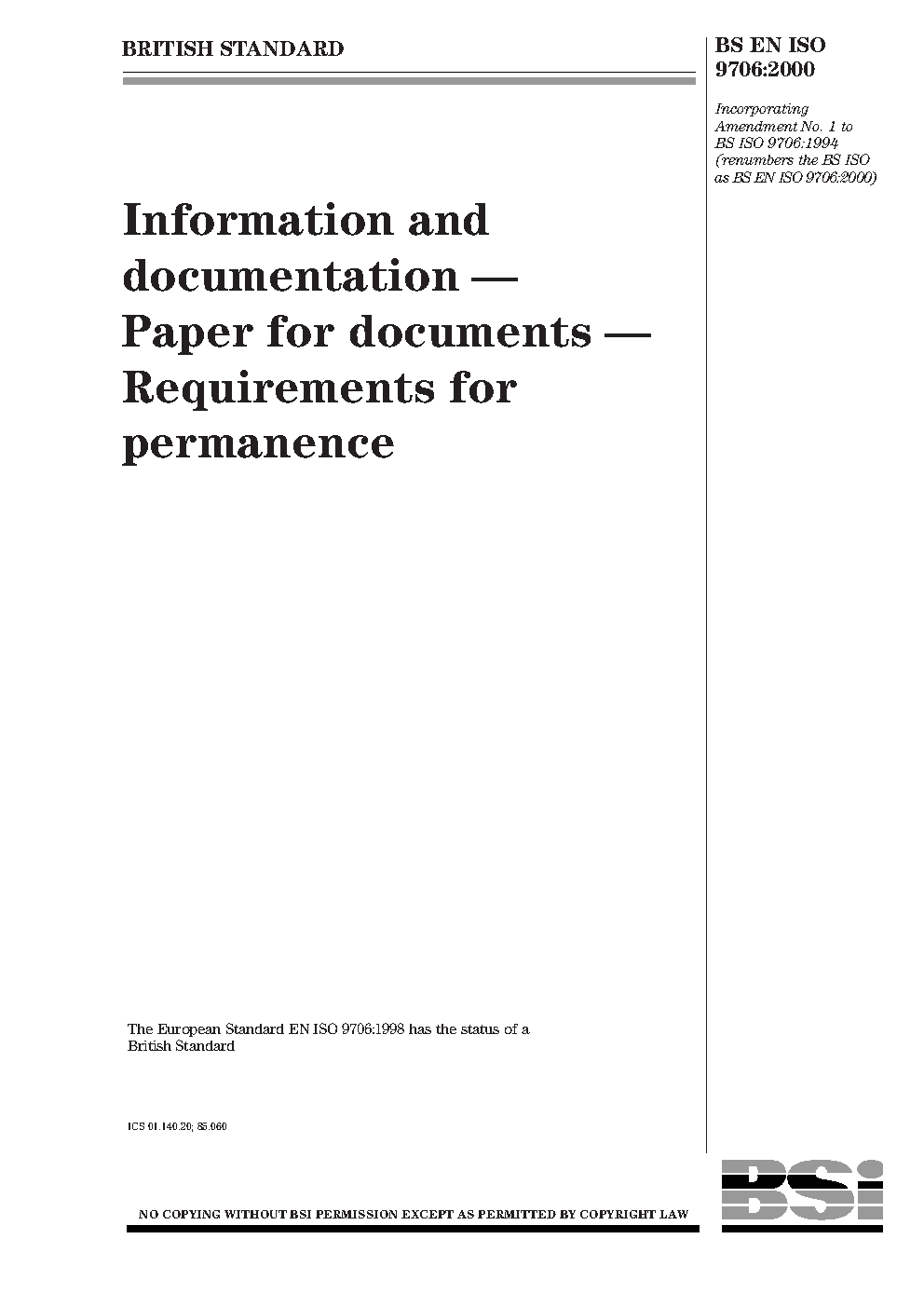 Information and documentation. Paper for documents. Requirements for permanence