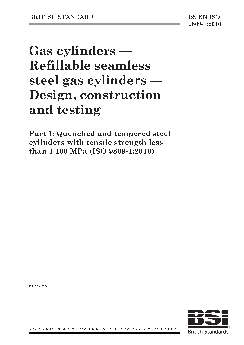 Gas cylinders. Design, construction and testing of refillable seamless steel gas cylinders tubes Quenched tempered with tensile strength less than 1 100 MPa
