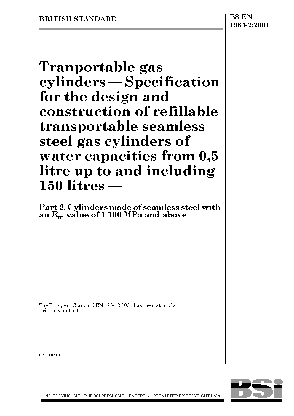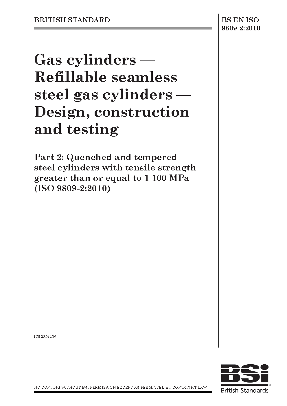 Gas cylinders. Refillable seamless steel gas Design, construction and testing Quenched tempered cylinders with tensile strength greater than or equal to 1100 MPa