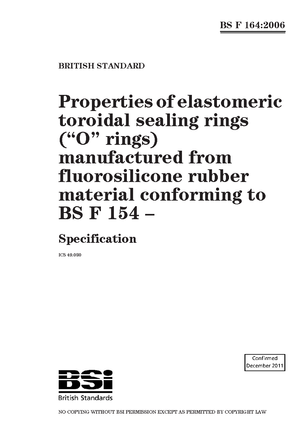 Properties of elastomeric toroidal sealing rings ("O" rings) manufactured from fluorosilicone rubber material released to BS F 154. Specification