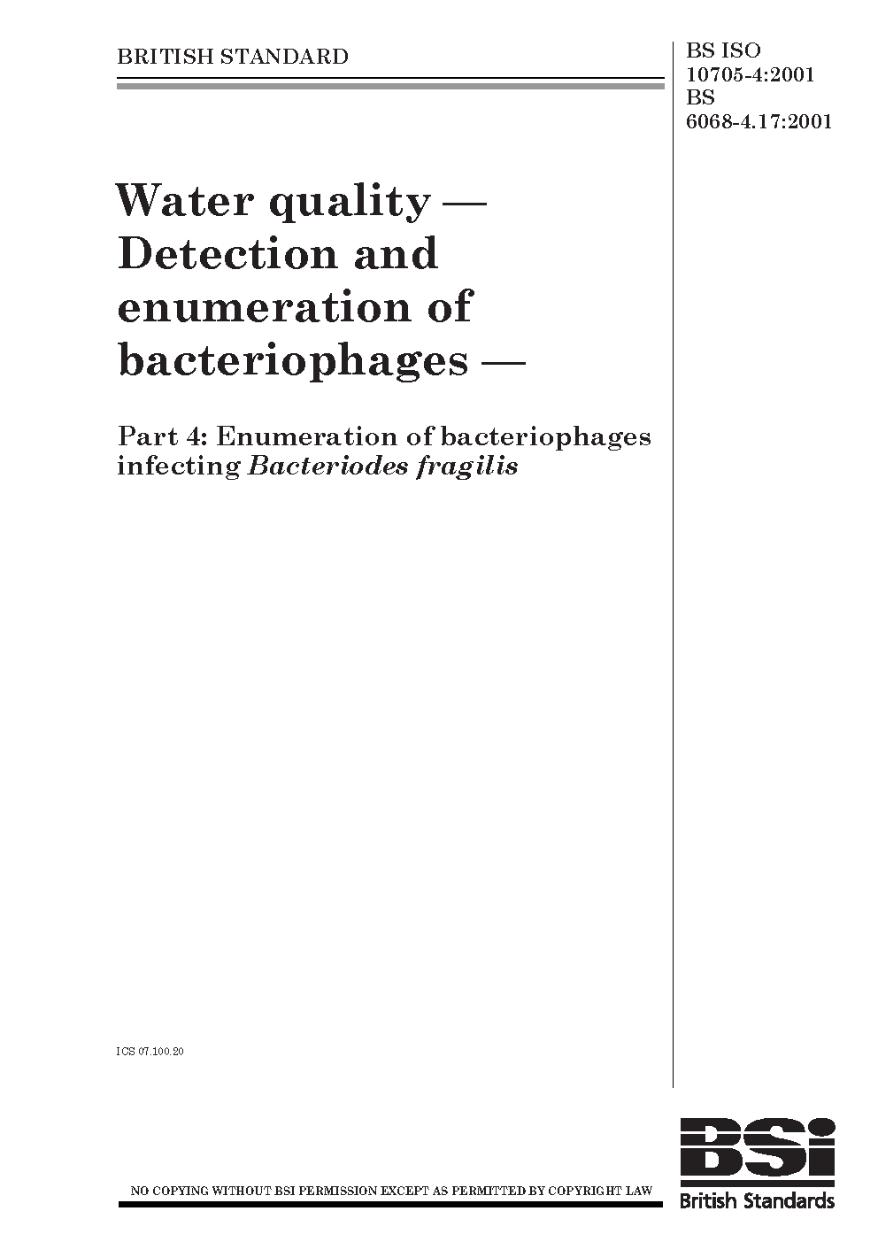 Water quality. Detection and enumeration of bacteriophages Enumeration infecting Bacteriodes fragilis