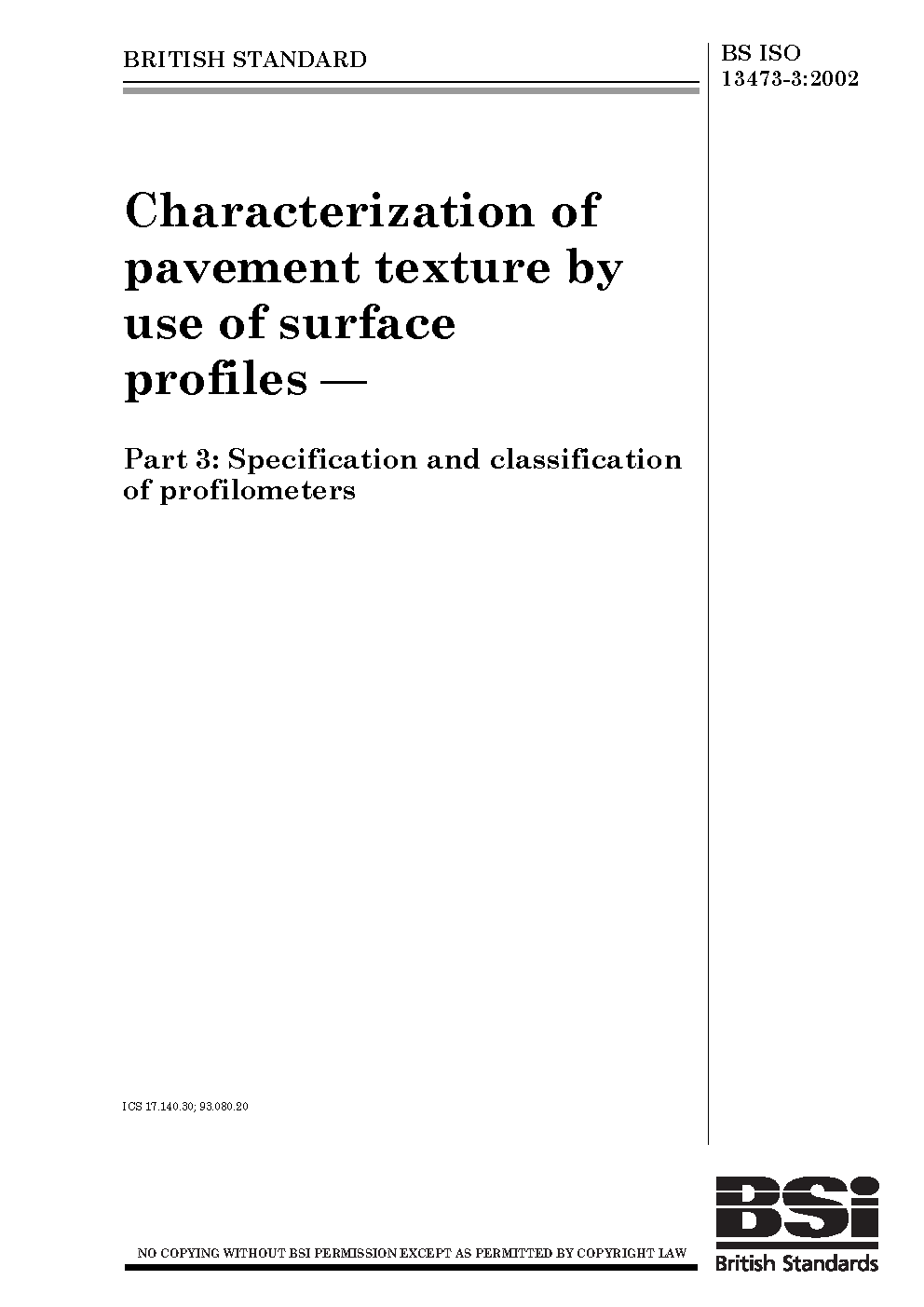 Characterization of pavement texture by use surface profiles Specification and classification profilometers