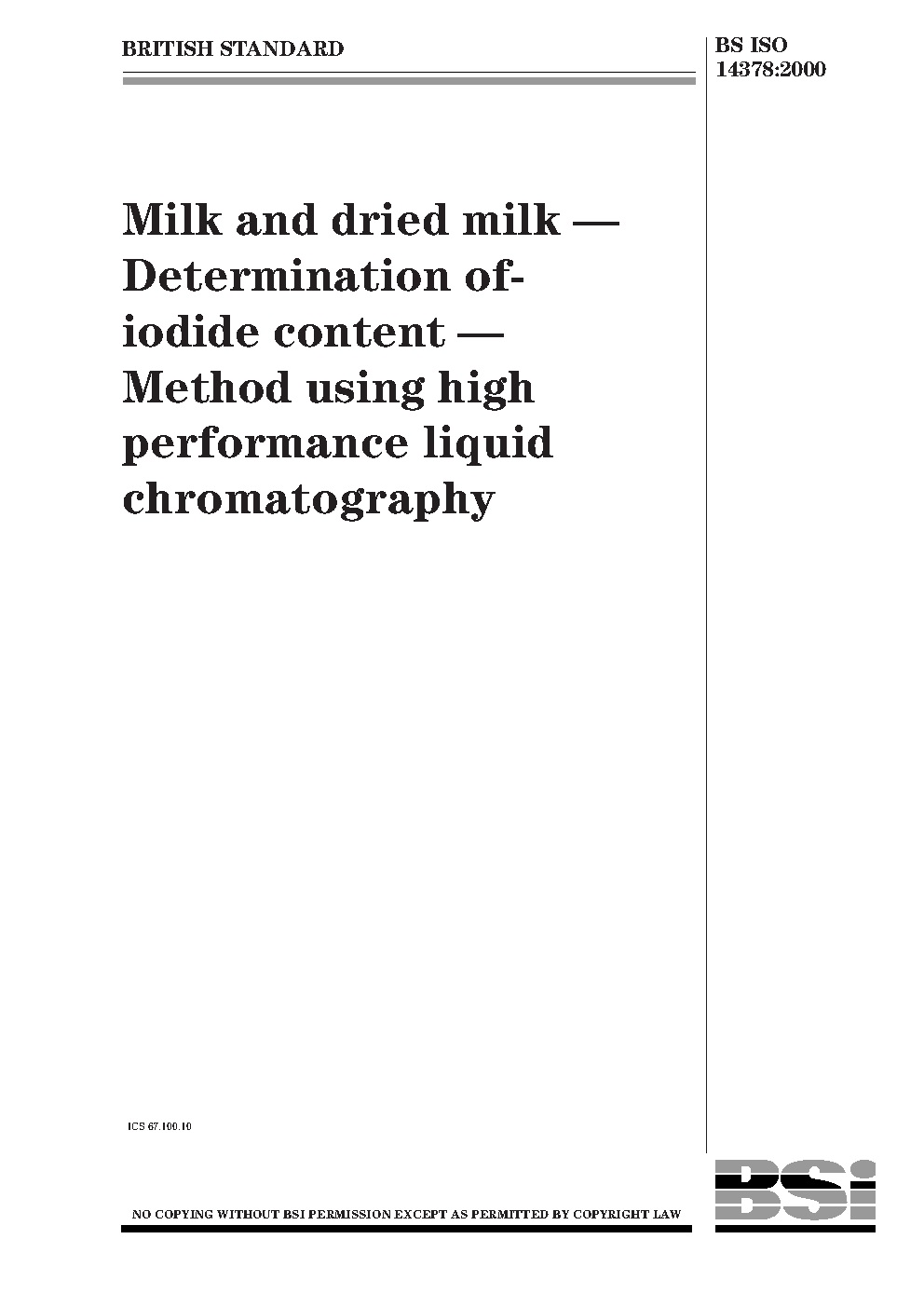 Milk and dried milk. Determination of iodide content. Method using high performance liquid chromatography