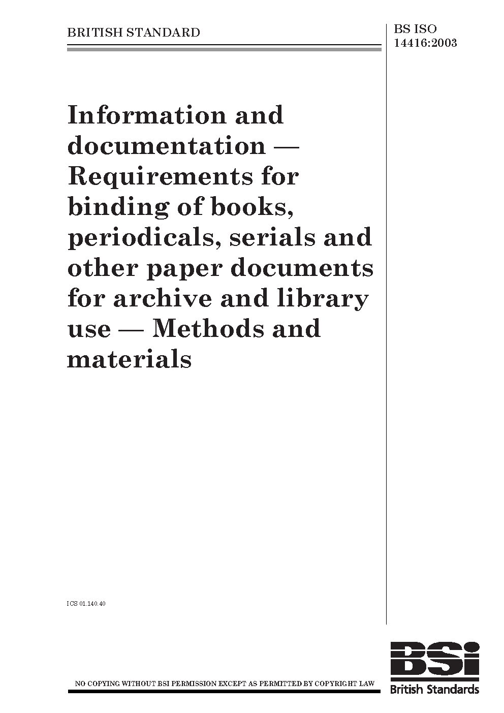 Information and documentation. Requirements for binding of books, periodicals, serials and other paper documents for archive and library use. Methods and materials