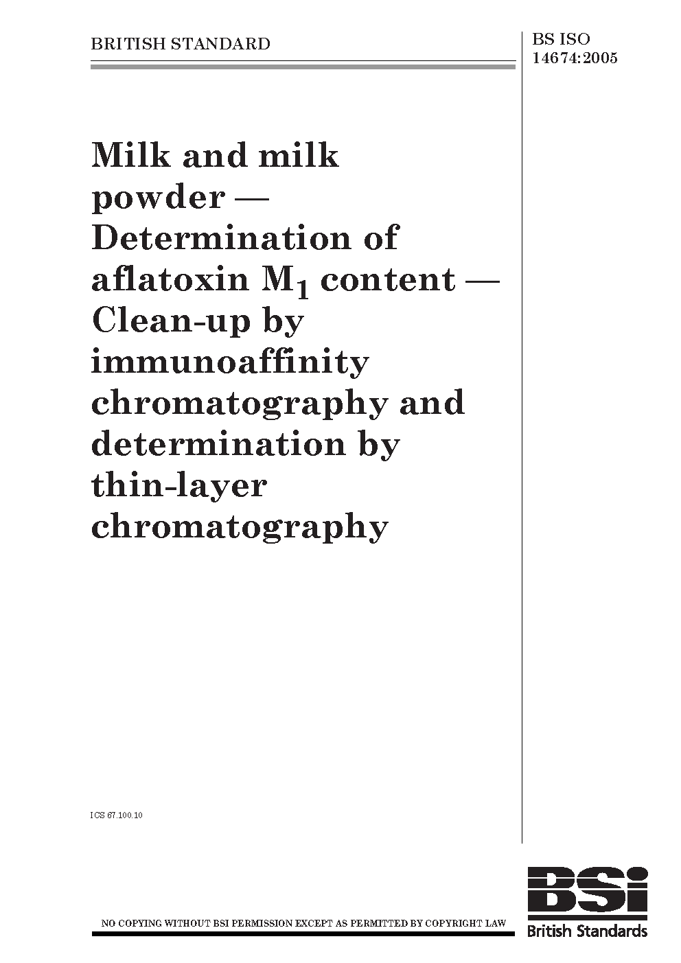 Milk and milk powder. Determination of aflatoxin M1 content. Clean-up by immunoaffinity chromatography and determination by thin-layer chromatography