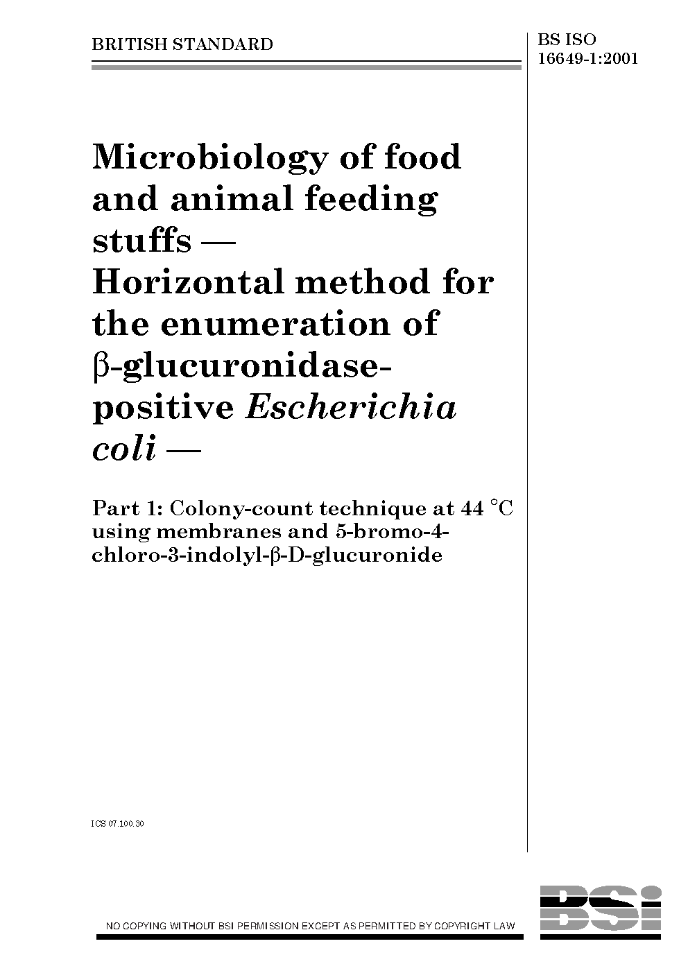 Microbiology of food and animal feeding stuffs. Horizontal method for the enumeration ß-glucuronidase-positive Escherichia coli Colony-count technique at 44°C using membranes 5-bromo-4- chloro-3-indolyl-ß-D-glucuronide