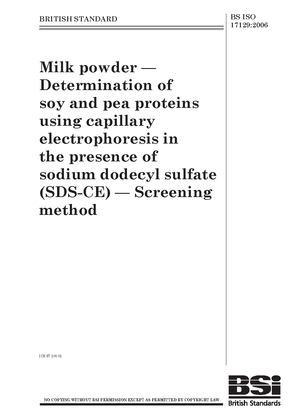 Milk and milk products. Determination of soy and pea proteins using capillary electrophoresis in the presence of sodium dodecyl sulfate (SDS-CE). Screening method