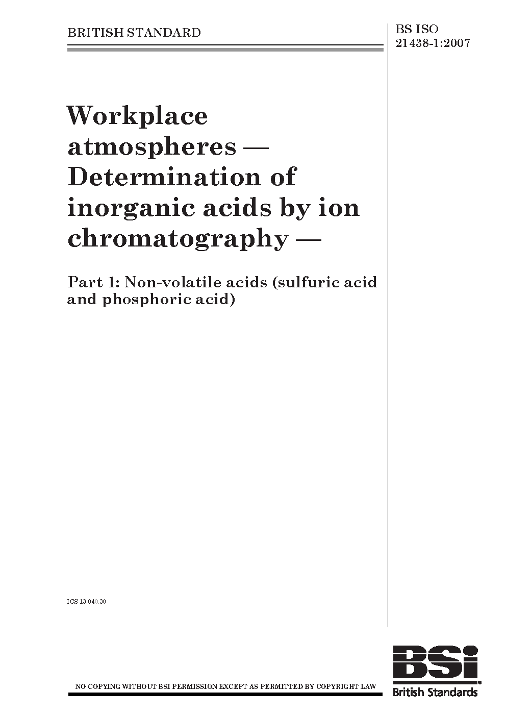 Workplace atmospheres. Determination of inorganic acids by ion chromatography Part 1: Non-volatile (sulfuric acid and phosphoric acid)