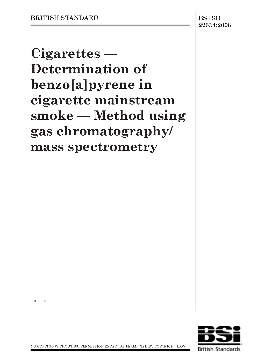 Cigarettes. Determination of benzo[a]pyrene in cigarette mainstream smoke. Method using gas chromatography/mass spectrometry