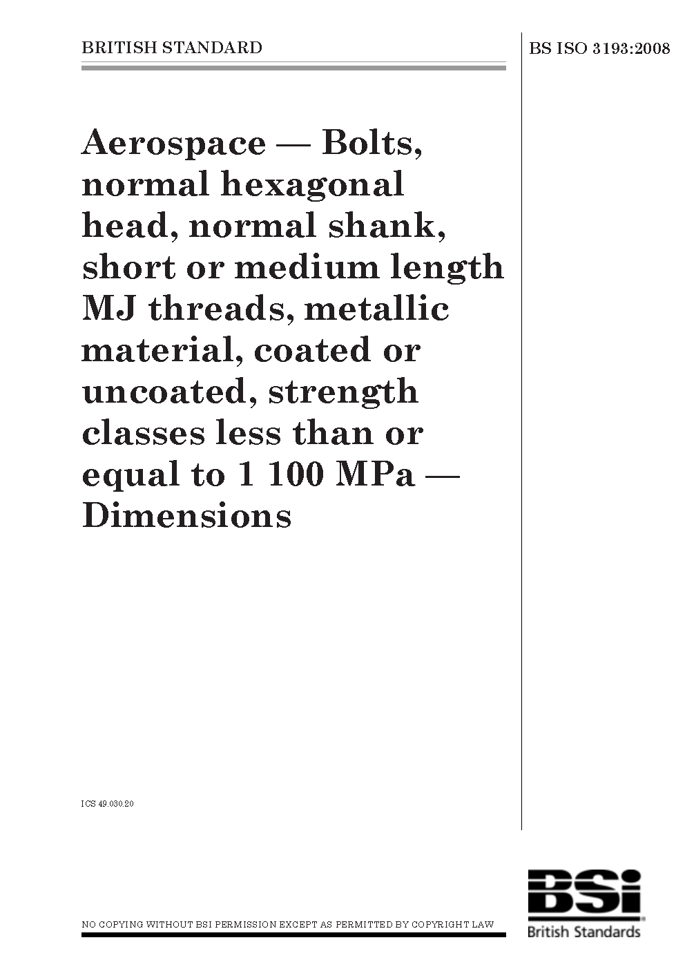 Aerospace. Bolts, normal hexagonal head, normal shank, short or medium length MJ threads, metallic material, coated or uncoated, strength classes less than or equal to 1100 MPa. Dimensions