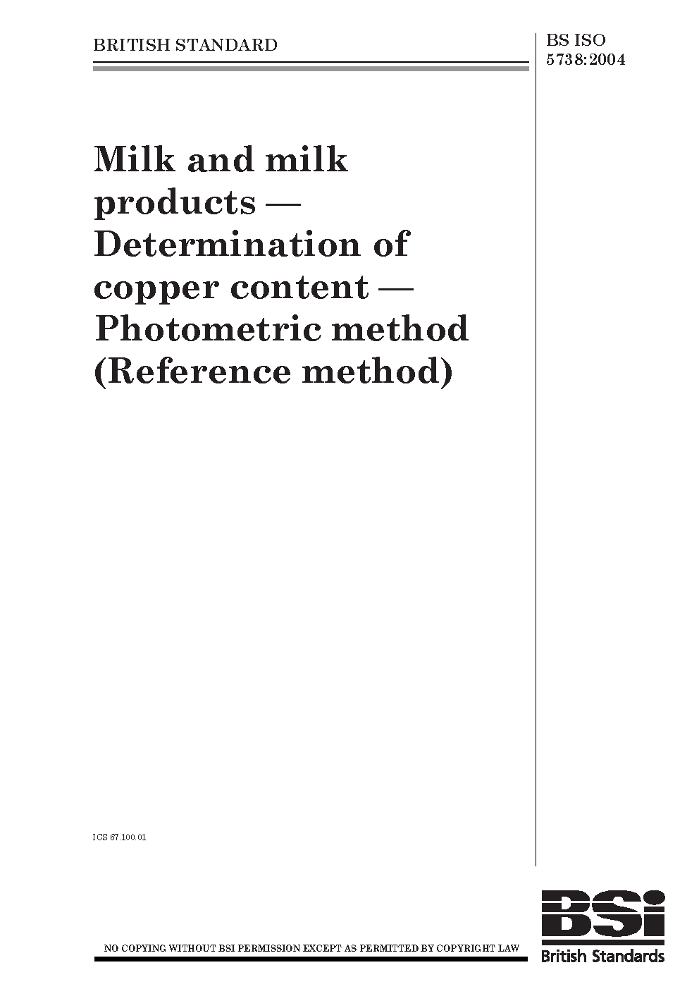 Dried milk;Chemical analysis and testing;Food products;Photometry (chemical analysis);Copper;Determination of content;Butter;Condensed milk;Butterfat;Skimmed milk;Cream (dairy products);Milk;Albumins;Evaporated milk;Casein;Dairy products;Cheese;Buttermilk;Ice cream