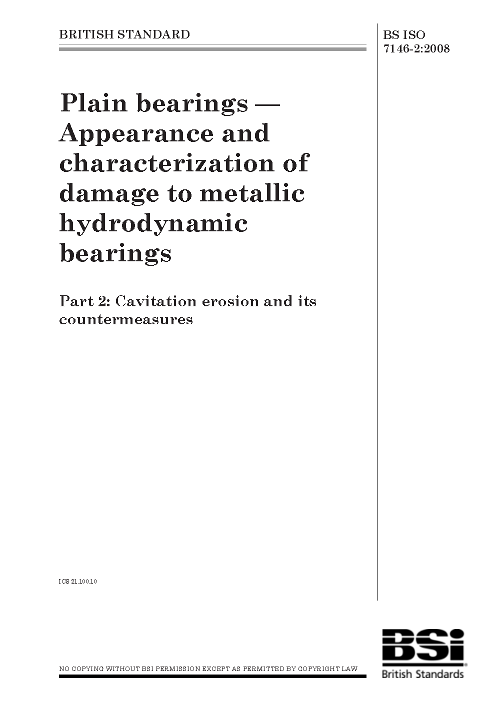 Plain bearings. Appearance and characterization of damage to metallic hydrodynamic bearings Cavitation erosion its countermeasures