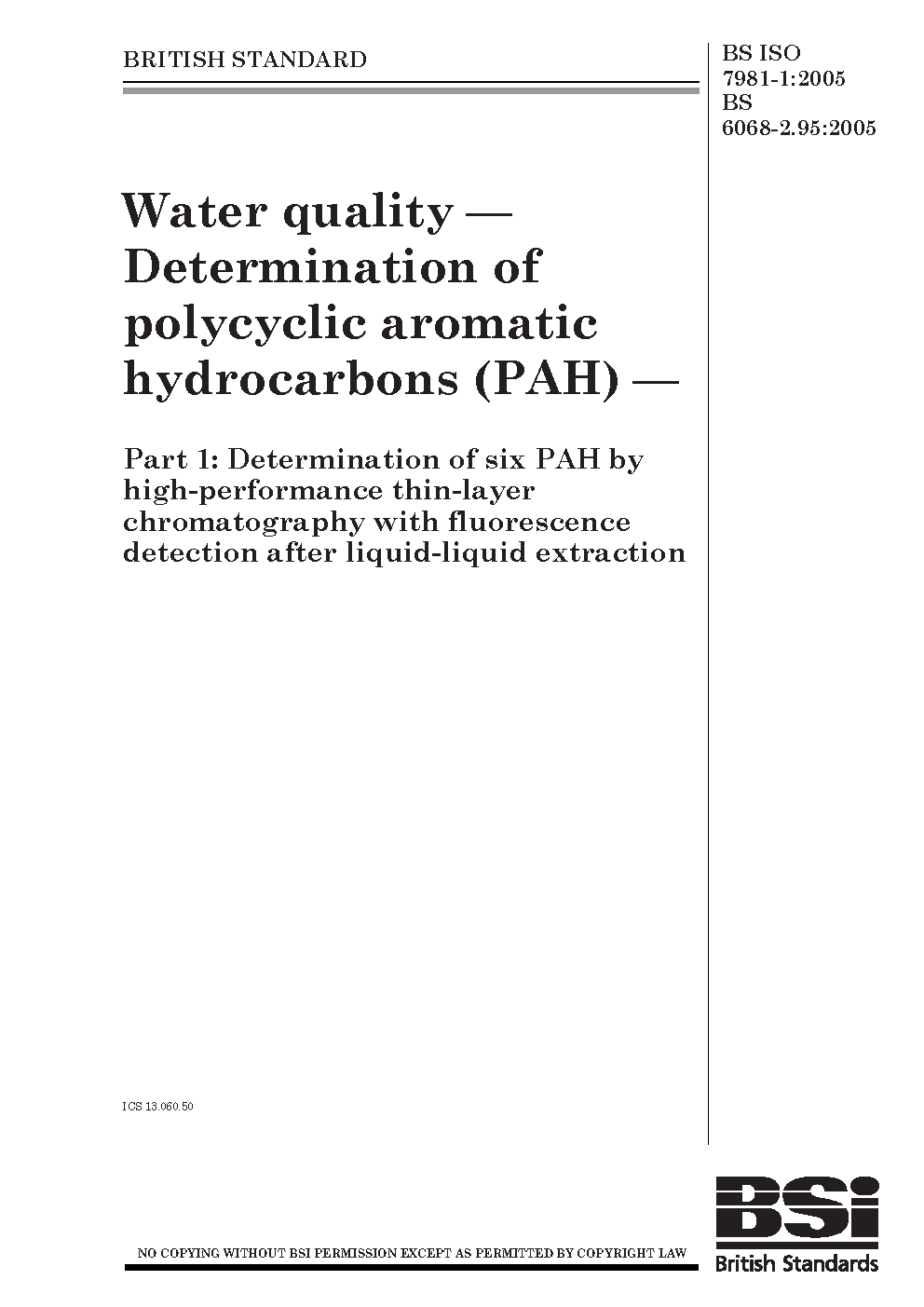 Water quality. Determination of polycyclic aromatic hydrocarbons (PAH) six PAH by high performance thin layer chromatography with fluorescence detection after liquid-liquid extraction