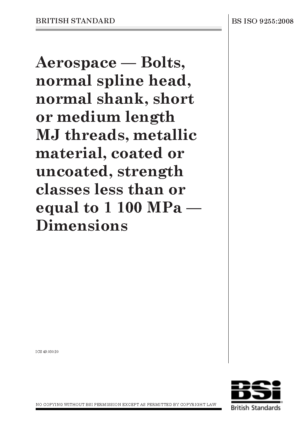 Aerospace. Bolts, normal spline head, normal shank, short or medium length MJ threads, metallic material, coated or uncoated, strength classes less than or equal to 1100 MPa. Dimensions
